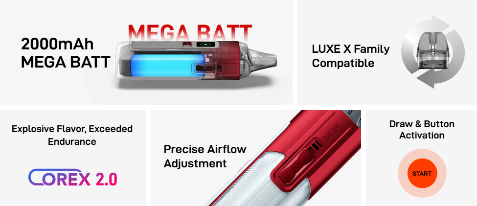 The Vaporesso Luxe X2 vape kit is a powerful, versatile device designed for both new and experienced vapers. With a robust 2000mAh built-in battery—over twice the capacity of most pod devices—it offers more than a day's worth of vaping. Capable of delivering up to 40W, it's compatible with all Luxe X pods and GTX coils, supporting MTL (Mouth To Lung) and RDTL (Restricted Direct To Lung) vaping styles.